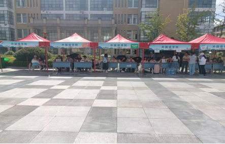精心布置了迎新报到服务点。红色的帐篷整齐排列,“金瓶梅