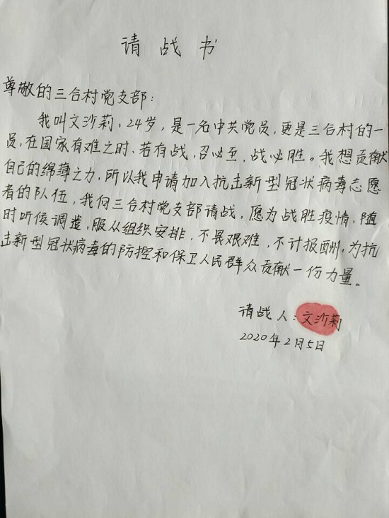 2016级英语专业的学生。疫情期间,文沙莉与父亲、妹妹一道,主动请缨参加本村的疫情防控工作。文沙莉同学表示:“我们家是三合村典型的精准识别贫困户,我们姐妹俩读书都是政府的资助,村委又安排了父亲护林员工作。现在正是新型冠状病毒肺炎防控的关键期,三合村面积大、出入人员多,村委的人力又不够,我们应该为三合村的疫情防控工作贡献我们的力量,回报社会。”她深知作为一名学生党员肩负的责任和使命,返乡人员的摸底排查、数据录入、防控知识的宣传,她样样不含糊。“村里的老人大多不会上网,对这次疫情的严重性和防范措施知之甚少,我必须不厌其烦地一遍又一遍地对他们进行知识宣传和劝导。作为一名大学生,我有这个责任和义务!”文沙莉说。
