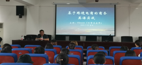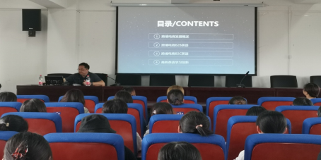 讲座开始前,系主任成雪梅老师对主讲人王斌老师进行介绍。紧接着,王老师以“什么是跨境电商?”这一问题开展学术讲解,涵盖了跨境电商的发展历史及产品创新的案例到B2B、B2C英语,商务英语专业的学生进行学习创新四个内容。王老师建议大家多看英文杂志,多浏览国际交易平台网页促进大家对跨境电商的理解。