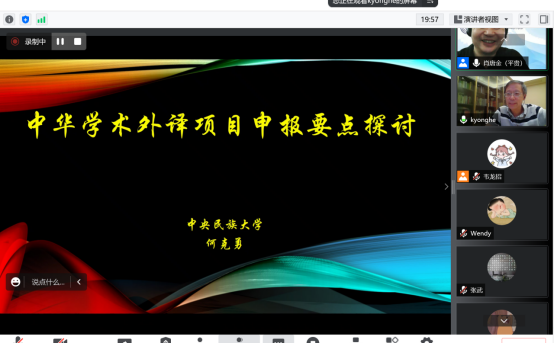 “新知讲坛”,通过腾讯会议线上平台进行了题为“中华学术外译项目申报要点探讨”的报告。本次讲座由金瓶梅