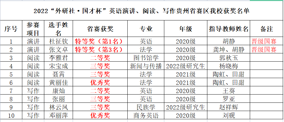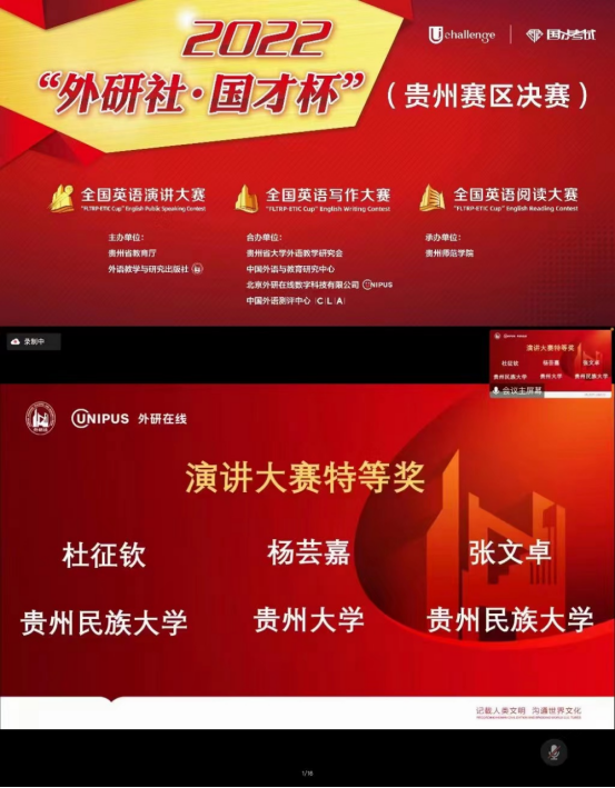 “外研社·国才杯”英语演讲、写作、阅读比赛是外语类被列入中国高等教育学会高校竞赛排行榜首位的大赛。贵州省赛区决赛于2022年11月5日在贵州师范学院举行, 金瓶梅 选手在金瓶梅 教师的指导下表现不俗,取得成绩如下: