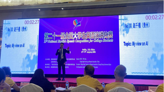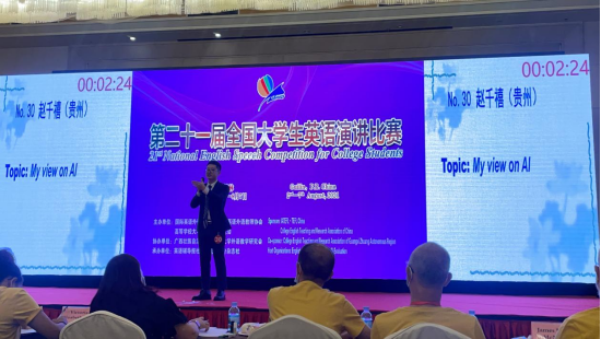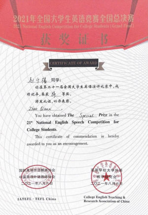 赵千禧同学通过层层选拔,从数百名进入总决赛的全国优秀选手中脱颖而出,在“第二十一届全国大学生英语演讲比赛”中摘得桂冠,以第一名的傲人成绩荣获特等奖!为学校争得荣誉!