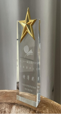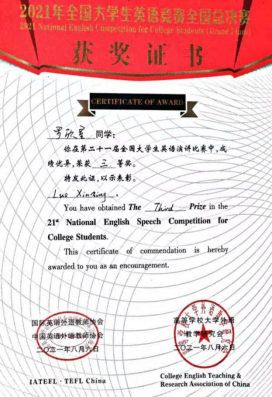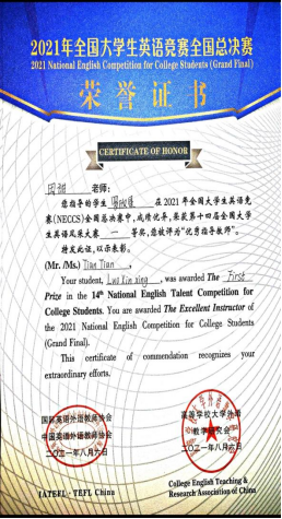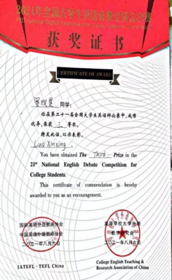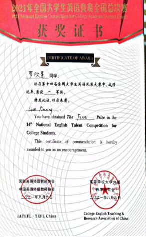 入围总决赛的罗欣星同学在田甜老师的指导下表现也很优秀,荣获“第十四届全国大学生英语风采大赛”一等奖和最佳个人表演奖,她在“第二十一届全国大学生英语演讲比赛”和“第二十一届全国大学生英语辩论赛”中分获三等奖!取得不俗成绩。