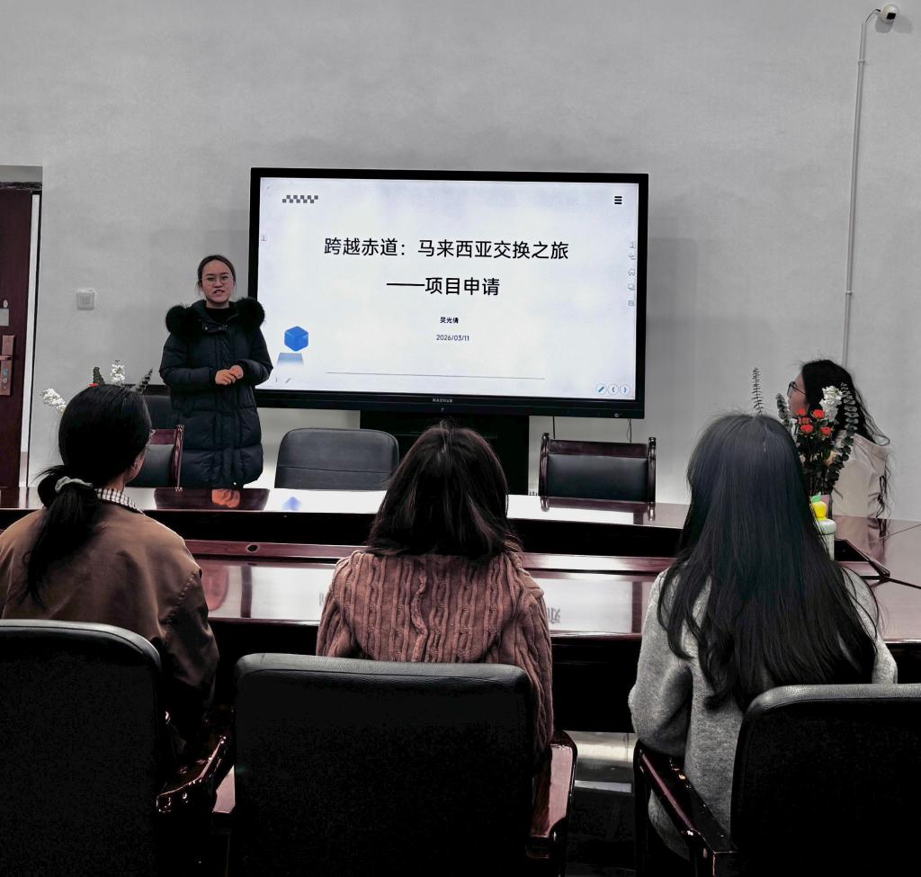 2024级英语笔译研究生吴光倩、张仪于2025年10月赴马来西亚拉曼大学进行交换学习,2026年1月圆满完成学习回国。在此次分享会上,吴光倩、张仪围绕“项目申请”“拉曼大学简介”“留学生活”“学习收获与心得”等方面展开分享。