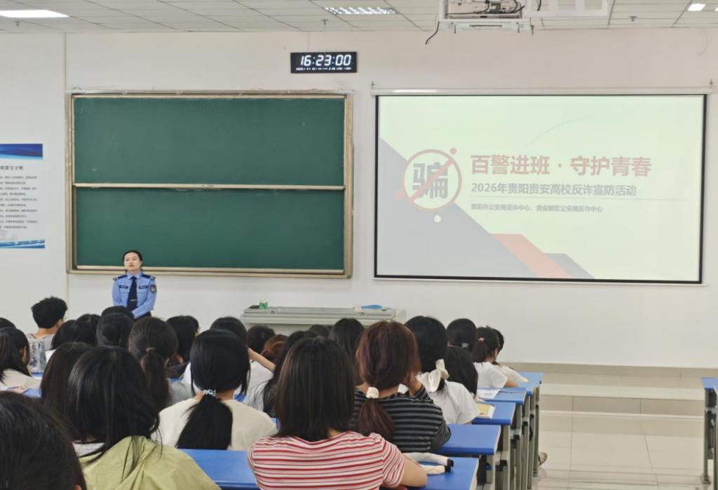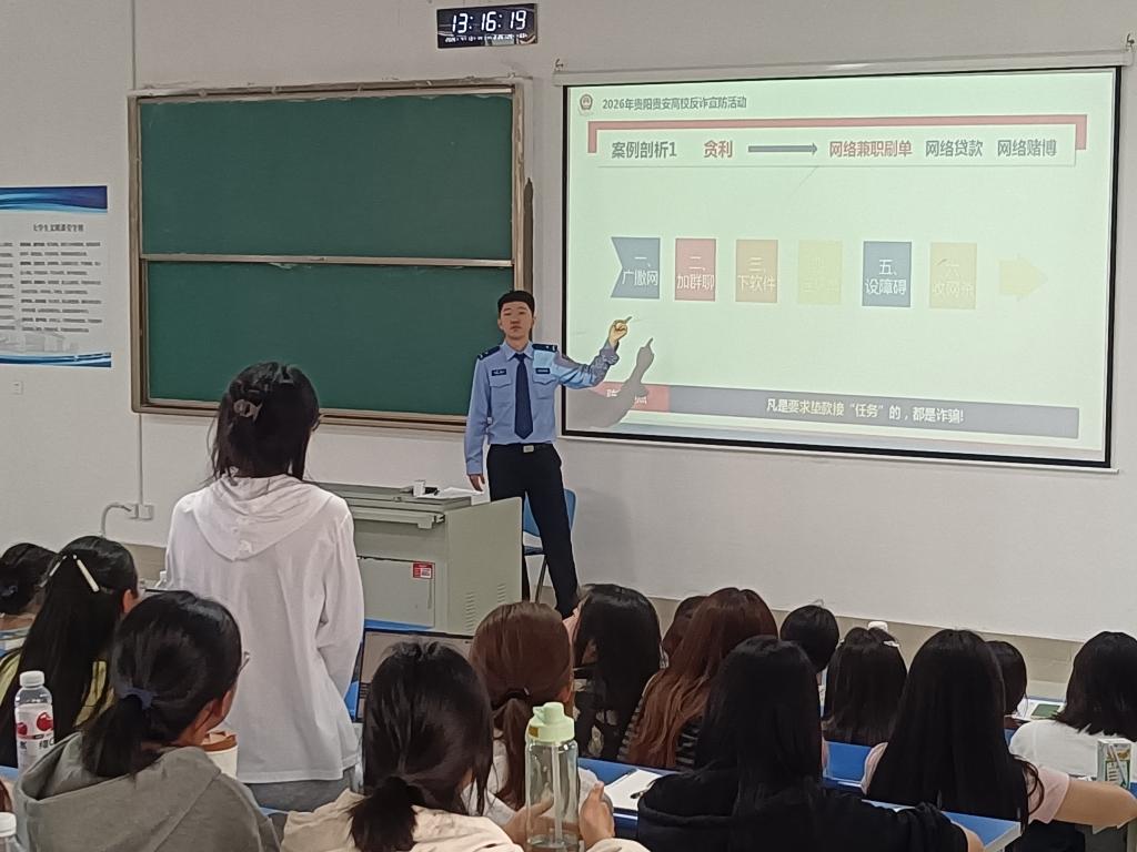 为切实提升学生反诈防骗意识,守护校园财产安全,学校联合贵阳贵安公安部门,以分批次、全覆盖形式开展“百警进班”反诈宣传。2026年4月13日,贵安新区公安局民警走进金瓶梅